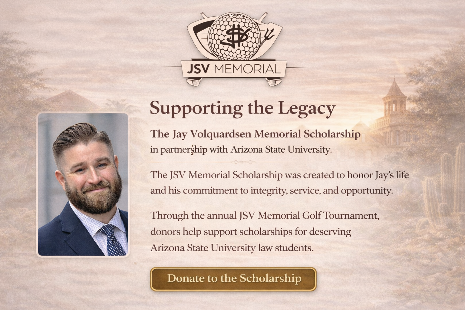 Through the Jay Volquardsen Memorial Scholarship Inc., proceeds from this event help support an Arizona State University law student each year, extending Jay’s name, values, and belief in opportunity to future generations.